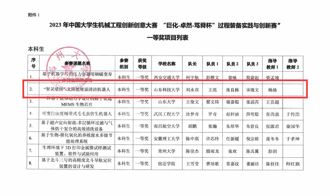点击:8月26日,由中国机械工程学会主办,郑州大学承办的的中国大学生机械工程创新创意大赛系列赛事——“巨化-卓然-笃舜杯”过程装备实践与创新赛总决赛落下帷幕。经过激烈角逐,开元官网学子斩获国家级一等奖1项、二等奖4项、三等奖2项,杨扬老师指导的项目《“智灵壁洁”-太阳能壁面清洁机器人》荣获国家一等奖。