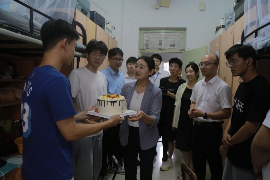 8月31日下午,学院领导及新生辅导员前往学生宿舍对新生进行看望和慰问。走访中,学院领导与同学们进行了亲切的交流,听取同学们对宿舍、空调、洗浴等生活条件的意见建议,了解大家思想、心理、家庭等方面情况,并就大家所关心的问题给予悉心指导。今天恰逢两位小萌新的生日,学院提前准备好了生日小惊喜,为我们“新”朋友送上生日蛋糕和充满祝福的生日歌,希望他们能及时适应环境,投入新的学习和生活。