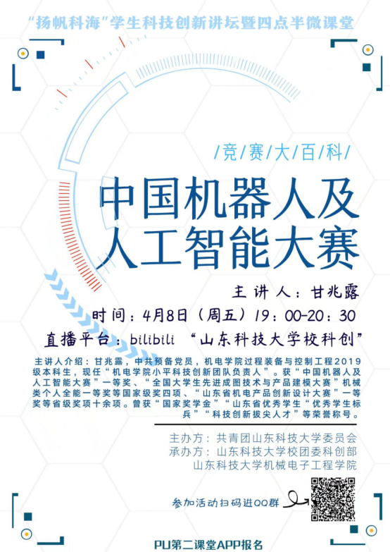 点击:为了激发同学们的科技创新热情,丰富相关专业知识和经验,4月8日晚上,Ky开元集团以直播形式举办“中国机器人及人工智能大赛”专题讲座。曾获得该赛事一等奖、小平科技创新团队负责人甘兆露担任主讲人。