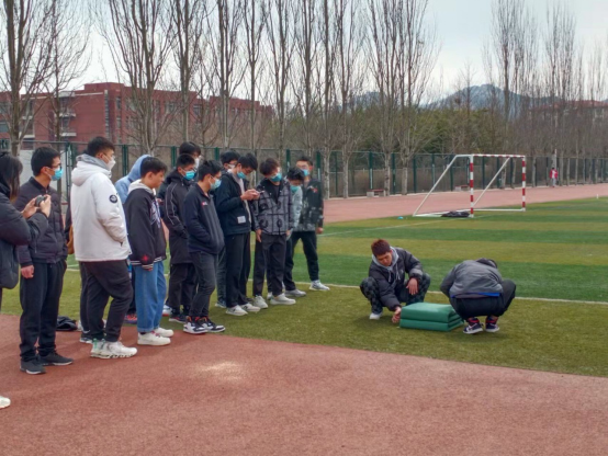 “我来教大家打军体拳!大家跟我做!”几天后,退伍老兵们发现部分学生因常待宿舍无精打采,为了增强同学们的身体素质,提高免疫力,严利君结合在部队学习到的科学训练方法组织同学们在高地操场进行军体拳、俯卧撑、深蹲、慢跑等一系列的体育锻炼。吴彪、袁龙则在操场上为同学们讲解示范叠军被,引导同学们做好内务整理与统一,确保宿舍环境清洁规整,帮助同学们树立正确的学习和生活态度。张鹏等退伍老兵积极响应国防先锋营的志愿者活动,脱下迷彩服,换上防疫服,在核酸检测现场维持现场秩序,保证检测工作的有序进行。
